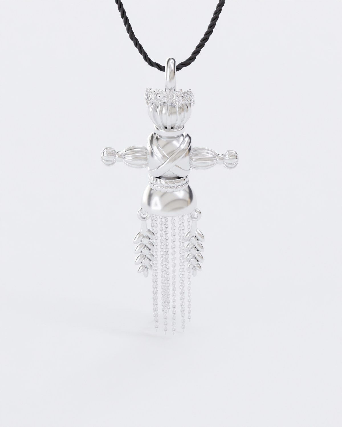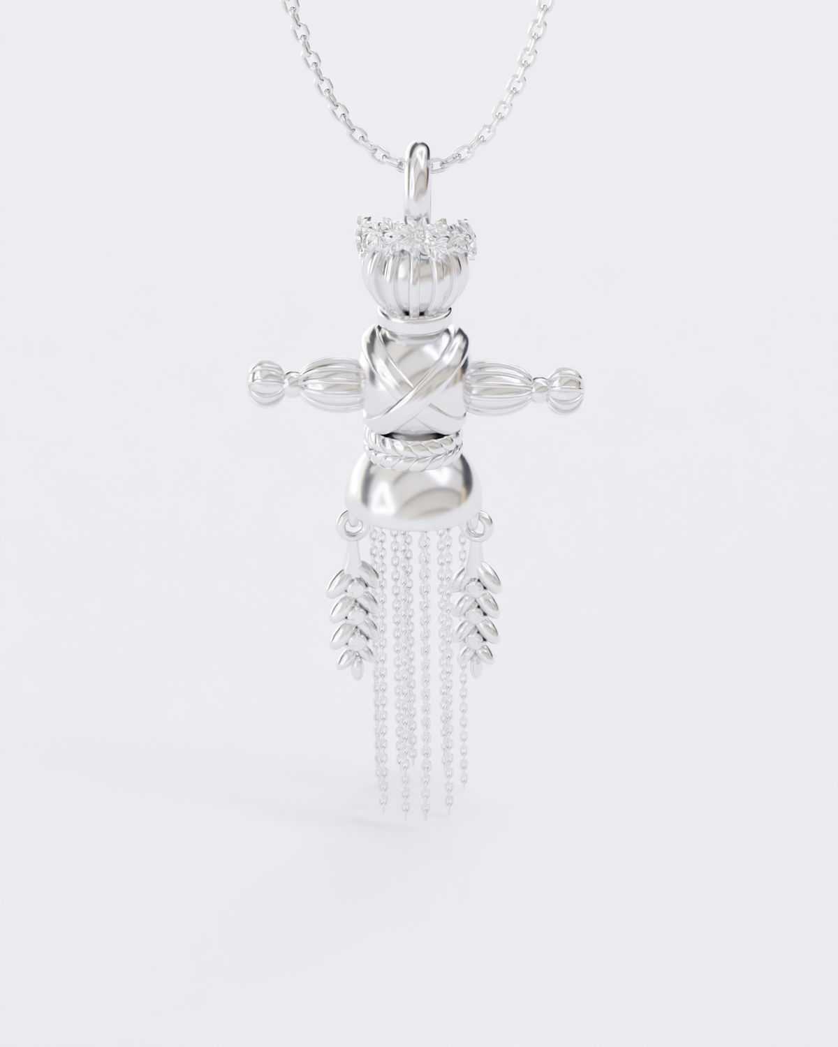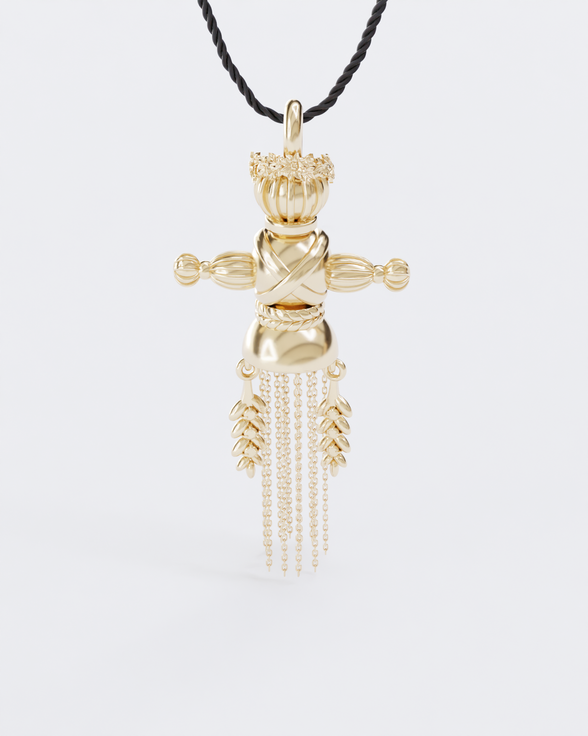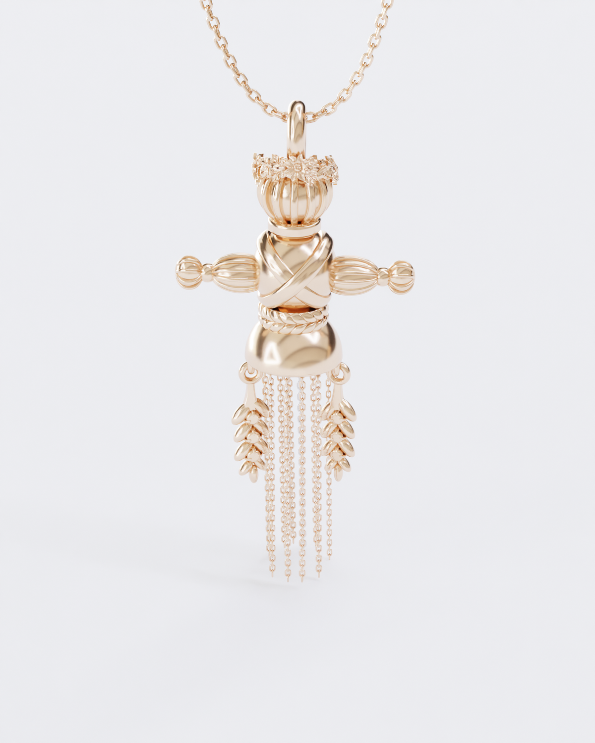The pendant consists of 18 parts, each of which is connected by hand. The head of the doll is decorated with a wreath.