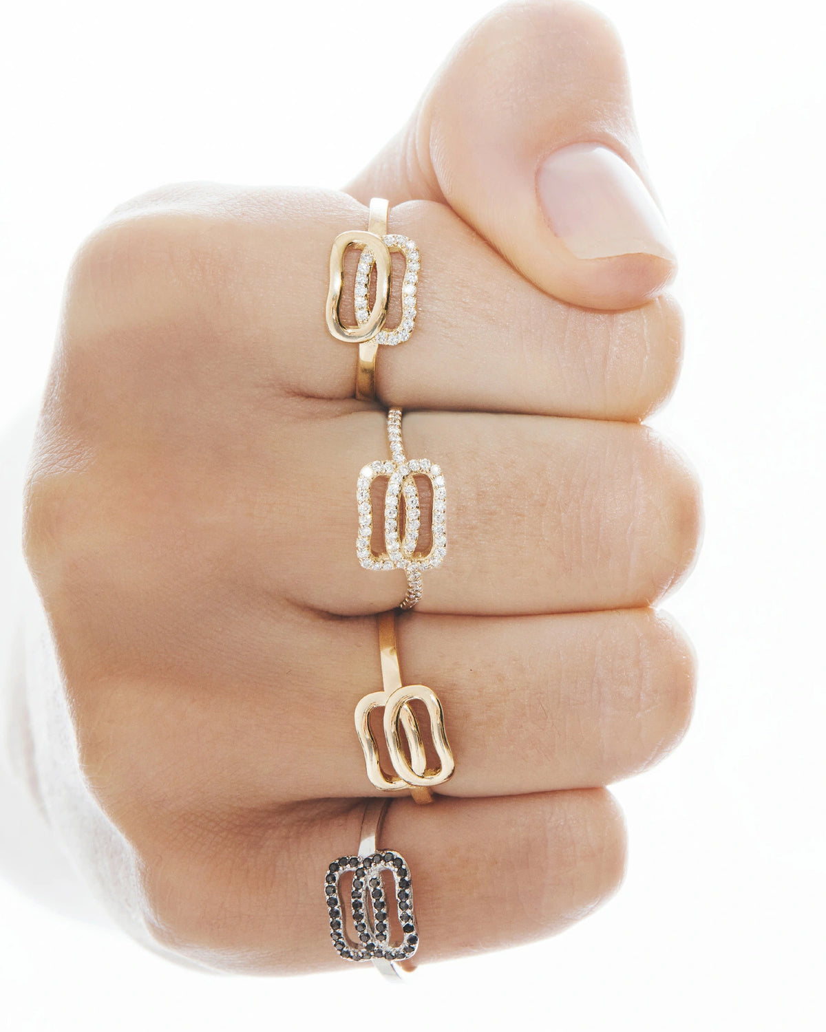 The collection is made in yellow, white and pink gold, decorated with diamond pavé and halfpave, which create a sophisticated play of light and the brilliance of diamonds. The line features pendants, earrings, rings and bracelets, designed for perfect combination in multi-layered compositions.